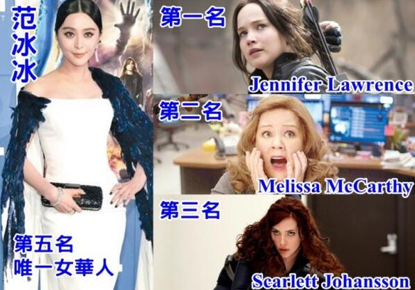 8月23日,福布斯官网发布2016年收入前十的女演员名单:詹妮弗-劳伦斯(4600万)登顶,梅丽莎-麦卡西(3300万)第二,斯嘉丽-约翰逊(2500万)第三,詹妮弗-安妮斯顿(2100万)第四(以上皆为美元)。范冰冰以1700万美元位列榜单第五名,成为榜单中的一位华人面孔,这是范冰冰连续两年进入榜单。