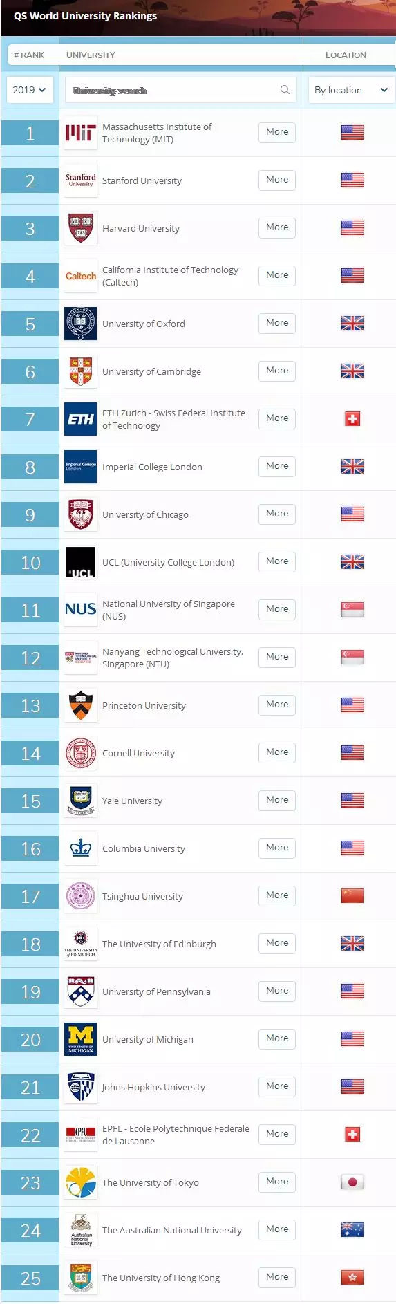 和去年一样,今年的QS大学排行榜的前四名依然被美国大学包揽!斯坦福大学、哈佛大学、加州理工大学分列二到四名。多数美国大学的排名都有所上升,TOP20里的耶鲁大学、哥伦比亚大学、密歇根大学都至少上升了一个名次。
