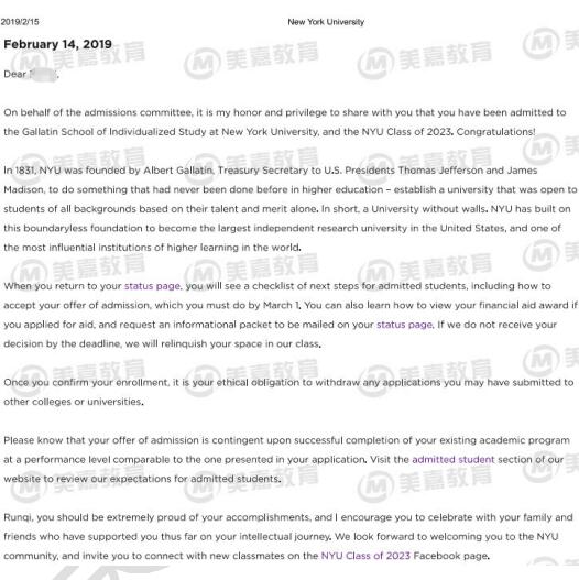 经过等待,宾大ED拒绝,密歇根安娜堡录取延期,UIUC EA录取,在这种结果下,我们立刻启动了第二批定校方案,经过沟通,针对学生兴趣广泛的特点,美嘉老师推荐了纽约大学的Gallatin School of Individualized Study迦勒汀个人学习学院。这个学院的学生可以自己DIY(do it yourself)进行课程设计、选专业、制定学习计划,毕业前需要写一篇论文证明自己设计的专业靠谱即可顺利毕业。这个学院的存在是纽约大学特别的创造,它打破了传统观念里选好大学专业后一条路走到黑的固有思维,鼓励学生不断发现和创新,自主确定未来的方向。学生了解之后非常喜欢并马上确认了递交纽约大学的EDII。12月底递交申请后在2019年1月14日,不到3周的时间内就获得了纽约大学的录取。至此,周同学的申请取得了圆满的结果。