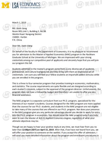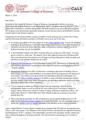 录取专业:Applied Economics and Management, M.P.S.(Ithaca)应用经济和管理专业