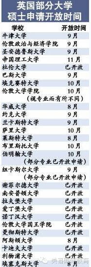 据了解,英国爱丁堡大学、南安普顿大学、杜伦大学等近10所院校已经开放2015年入学申请。而不同学校、同所学校不同专业的开放申请时间也有所差别,比如今年爱丁堡大学就提前开放了商科专业的申请,建议学生重点关注目标院校和目标专业的招生动态。