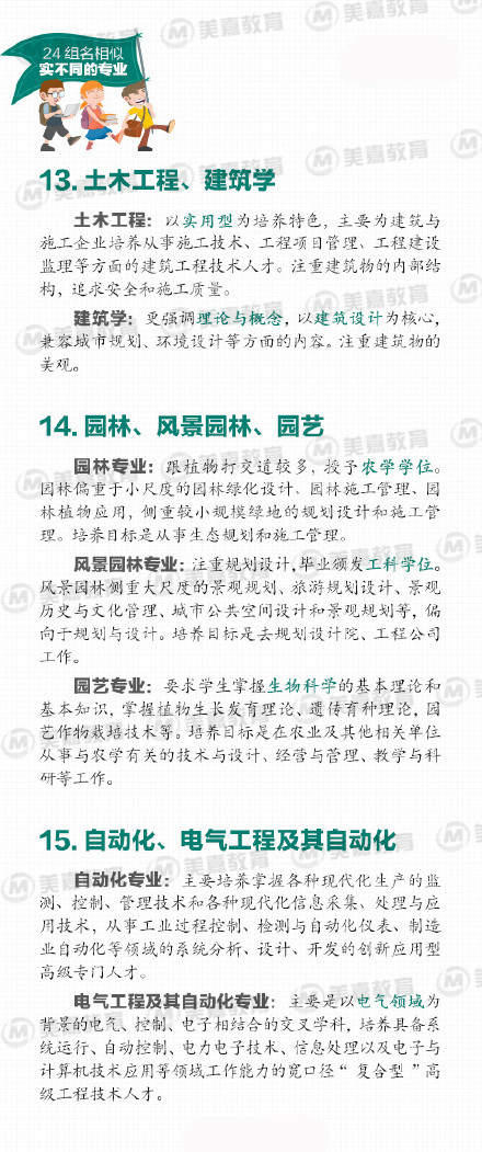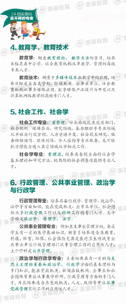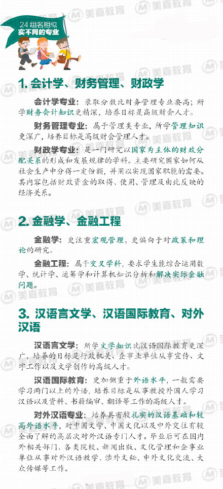 无论在读书还是出国留学,填志愿选专业都是头等大事!大学专业划分非常详细,很多专业名称相似,其实学科门类、课程内容、就业方向都差别巨大。美嘉教育列出24组名相似实不同的专业↓↓填志愿前务必弄清!