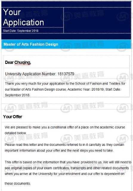 学生及家长通过朋友介绍找到的陈华老师,开始的时候学生定的出国方案是美国,但是在递交申请前,学生的托福成绩迟迟准备不出来,所以美国方案只能延期或取消。学生与家长了解了英国申请的特点,决定接受英国硕士的申请方案,由于学生想申请服装设计专业,学生需要准备作品集。在学生作品集完成的情况下,美嘉团队时间递交了学生的英国申请。