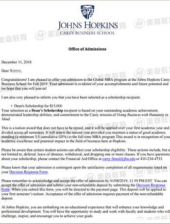 整个过程中,学生非常配合,在咨询时没有标化成绩的情况下,美嘉老师及时调配优质的语培资源给学生上课,学生终取得了托福109,GMAT 710的优异成绩。文书沟通过程中,陈老师和学生多次头脑风暴加外籍顾问的反复打磨至佳。终,在递交申请之后的1个月后,收到了来自全美前10约翰霍普金斯大学MBA的录取,更让人惊喜的是学校还提供了1.5万美金的奖学金给学生。家长及学生都非常满意,同时也感谢美嘉老师的辛苦付出。