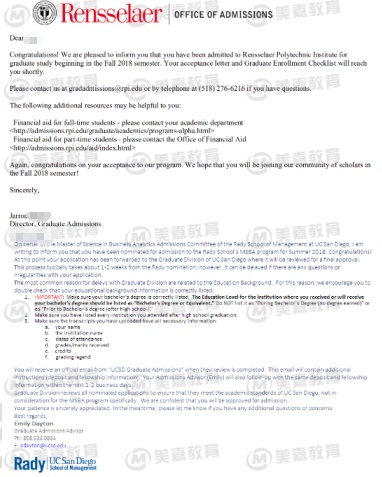 录取院校:Washington University (St. Louis)圣路易斯华盛顿大学、Rensselaer Polytechnic Institute伦斯勒理工学院、University of California, San Dieg加利福尼亚大学圣地亚哥分校、Case Western Reserve University凯斯西储大学